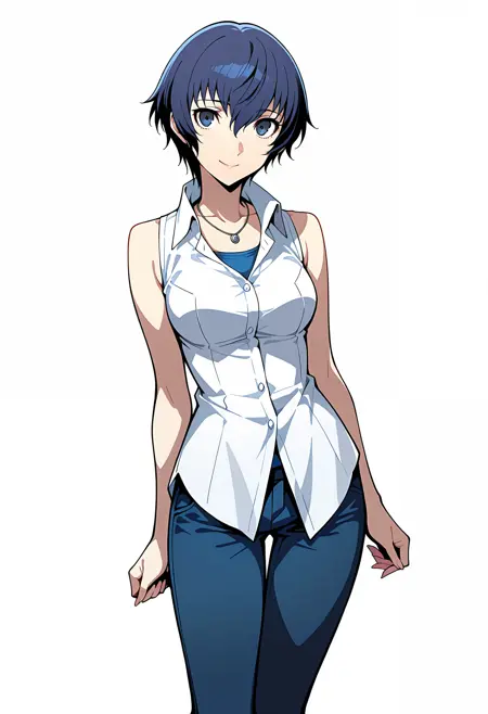 p4naoto-timeskip, 蓝色长裤, 无袖衬衫, 白色领衬衫, 衬衫未塞入, 裸露肩膀, 锁骨, 项链, 蓝色背心, 七分裤, 中等胸部,