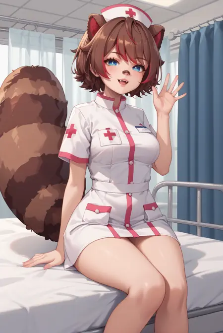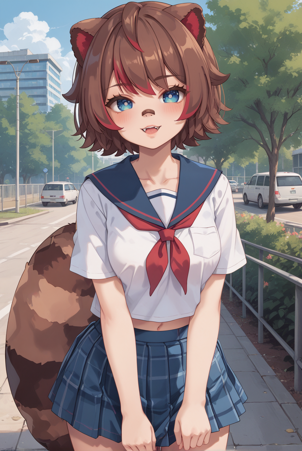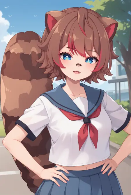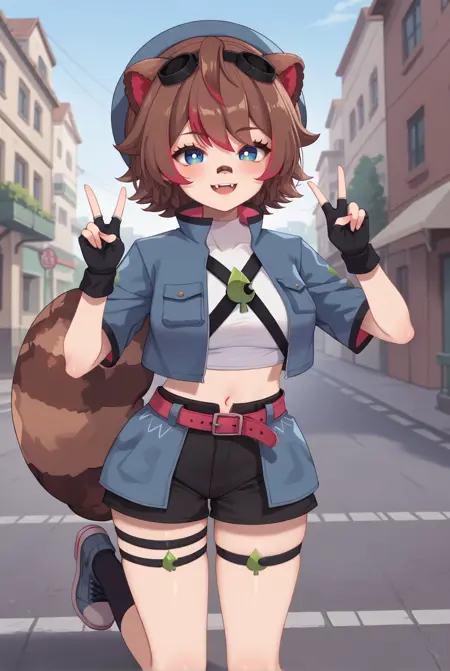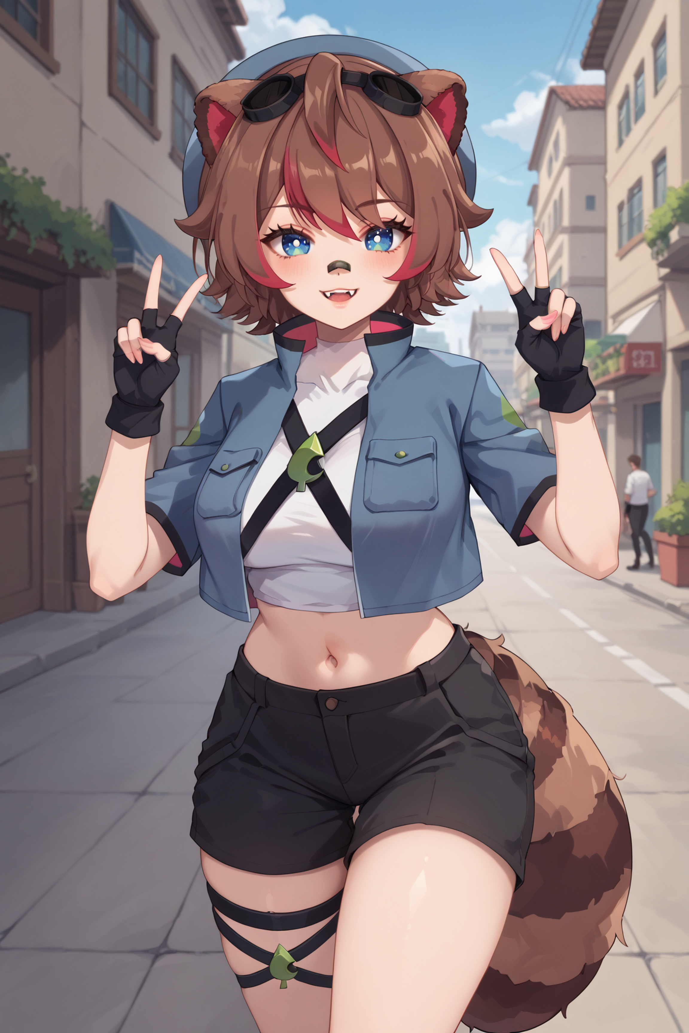 外观:短发,棕色头发,条纹发,蓝眼睛,鼻子上贴着创可贴,浣熊耳朵,浣熊尾巴,尖牙。
