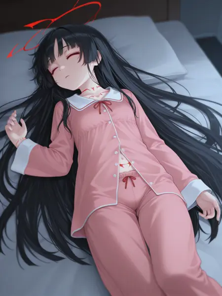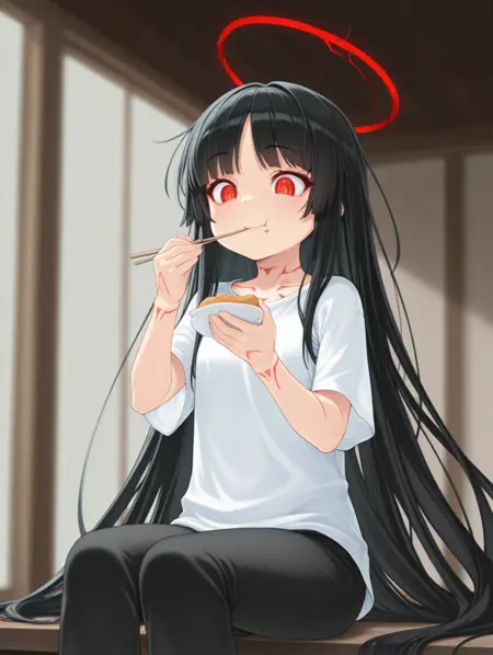 Chaos, black hair, very long hair, bangs, red eyes, (halo:0.6), body tattoo, black kimono, black skirt,