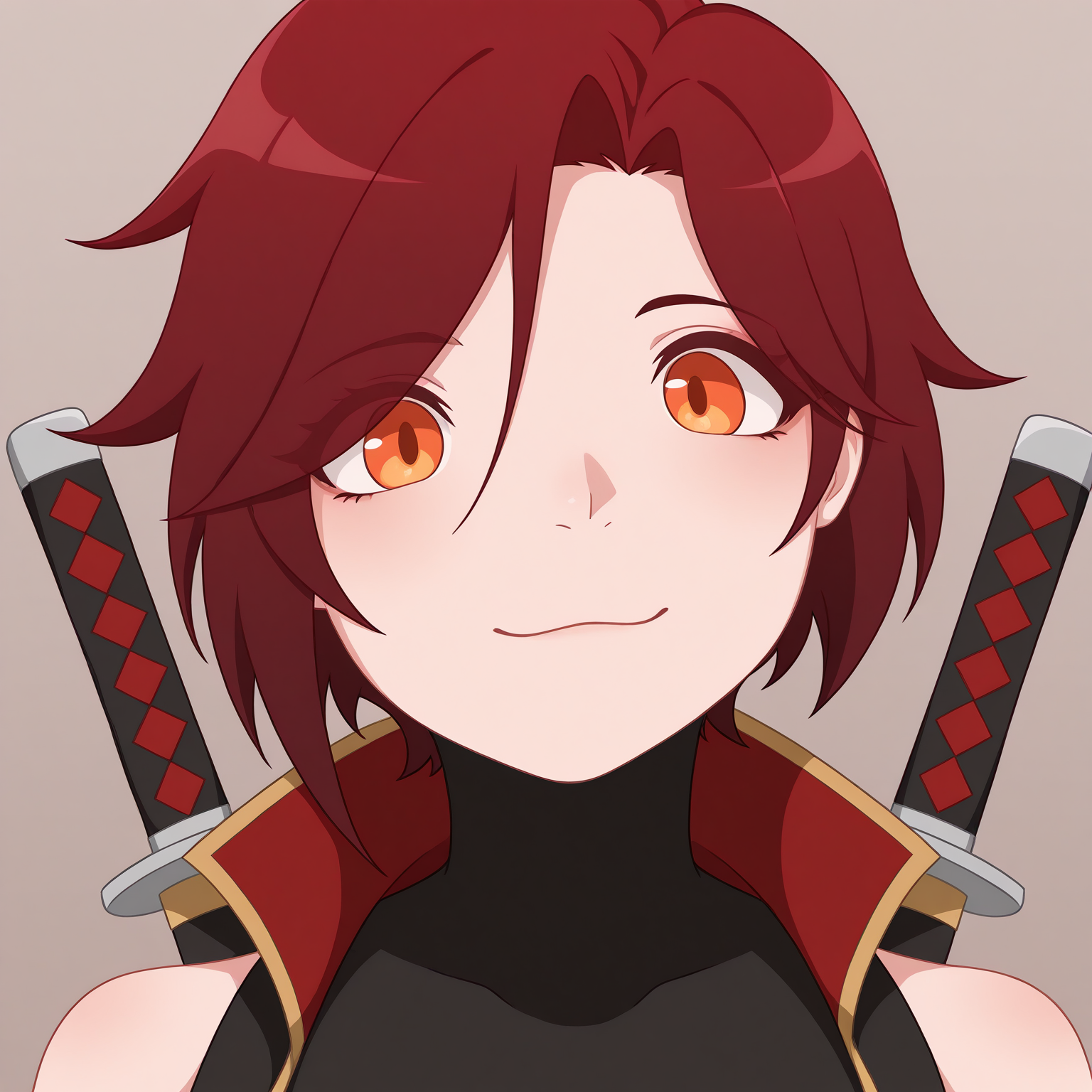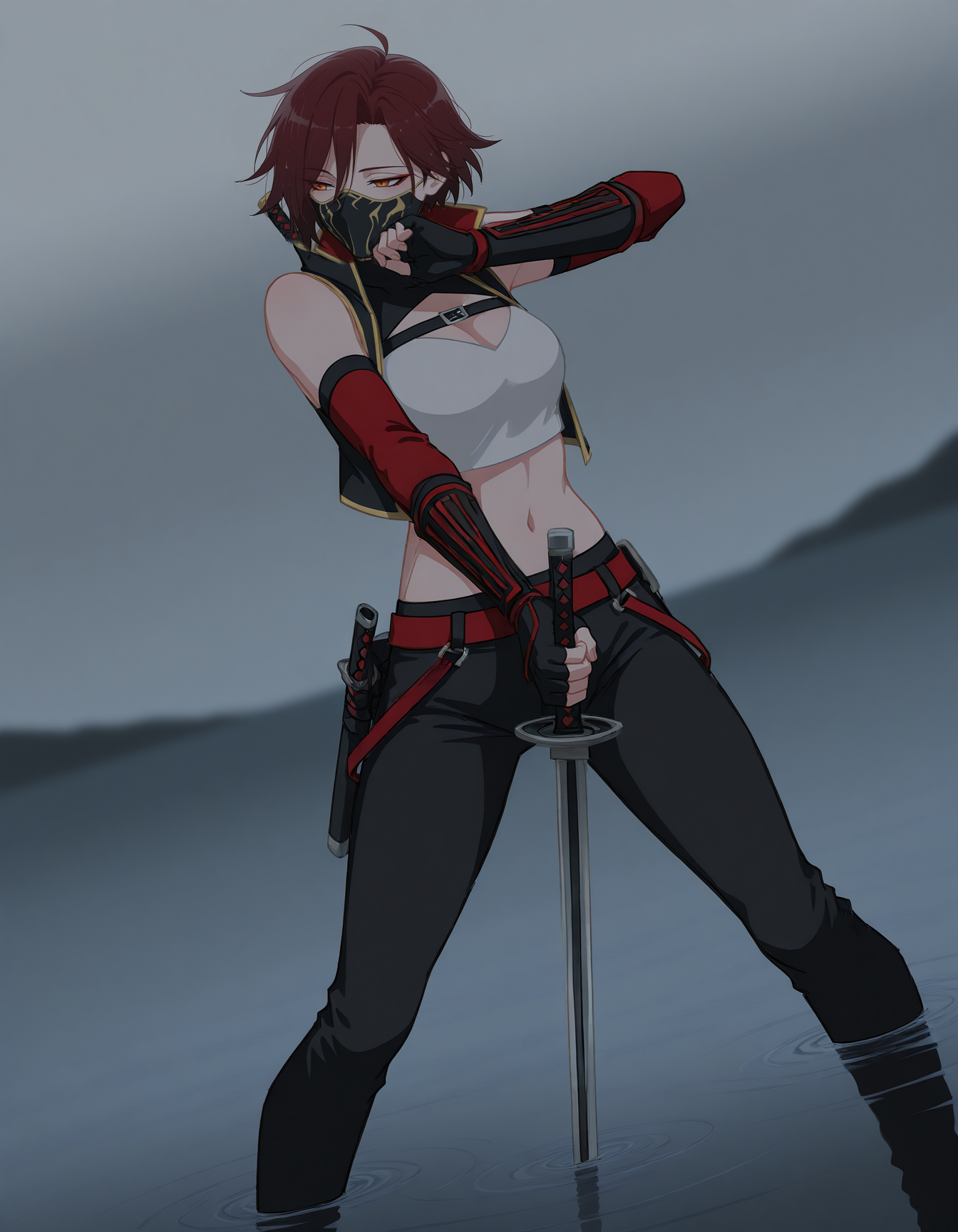 프롬프트: Shira, 주황색 눈, 짧은 짙은 빨간 머리, 검은 손목 없는 베스트, 흰색 크롭탑, 소매 없음, 등 뒤에 카타나.