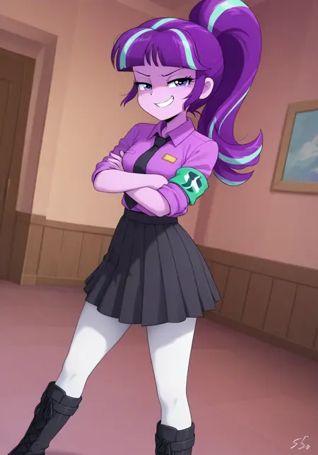 • I also tried to get the fan-made S5-style Equestria Girl Glimmy: starlight glimmer, equestria girls, colored skin, indigo eyes, purple hair with aquamarine streaks, s5sg, blunt bangs, purple collared shirt, black necktie, equality armband, boots