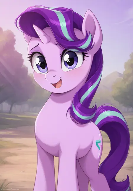 • Normal Glimmy: starlight glimmer, pony, unicorn, indigo eyes, purple hair with aquamarine streaks(and you might also want to put blunt bangs, s5sg in the negative prompt)
