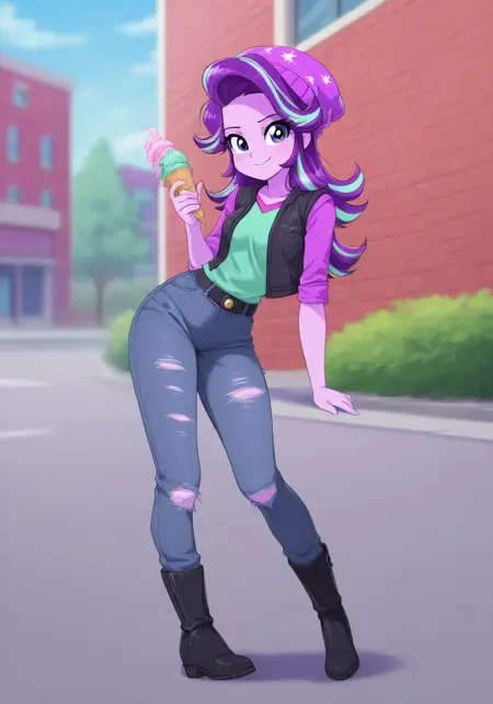 • Equestria Girl Glimmy: starlight glimmer, equestria girls, colored skin, indigo eyes, purple hair with aquamarine streaks, shirt, vest, boots, ripped pants