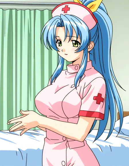 Tenkawa_Ayumi_OVA, 1girl, solo, 蓝发, 马尾, 绿眼, 黄色丝带, 大胸部, 头饰丝带, 2000年代(风格), 动画上色
