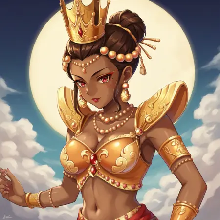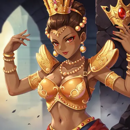 1girl, dark skin, solo, dark-skinned female, jewelry, breasts, red eyes, bracelet, cleavage, earrings, monster girl, navel, armlet, necklace, crown, lipstick, makeup, medium breasts,very short hair,hair bun,crown,brown hair,makeup,armor,only one mole under eye,
