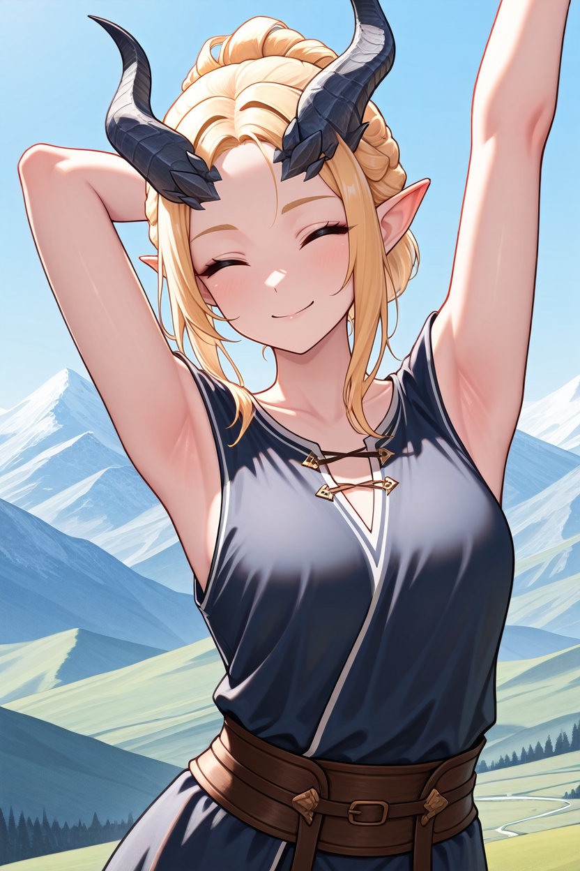 BGMainFemale, 1girl, blonde hair, hair updo, blue eyes, demon horns, pointy ears