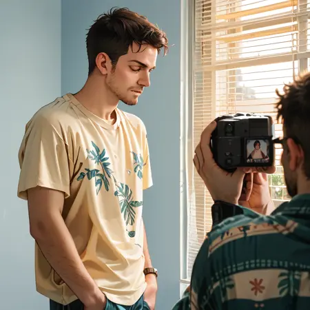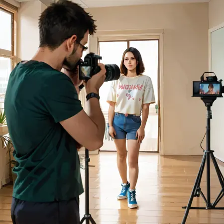 taking photo, photoshoot, 1girl, 1boy, holding, male photographer