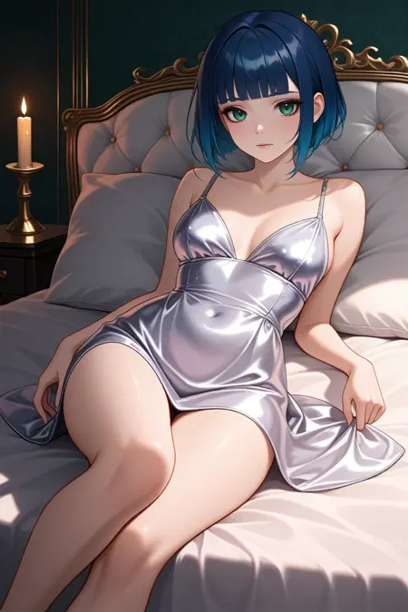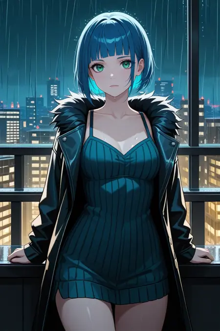 CyberEvelyn, 1girl, blue hair, short hair, green eyes, blunt bangs