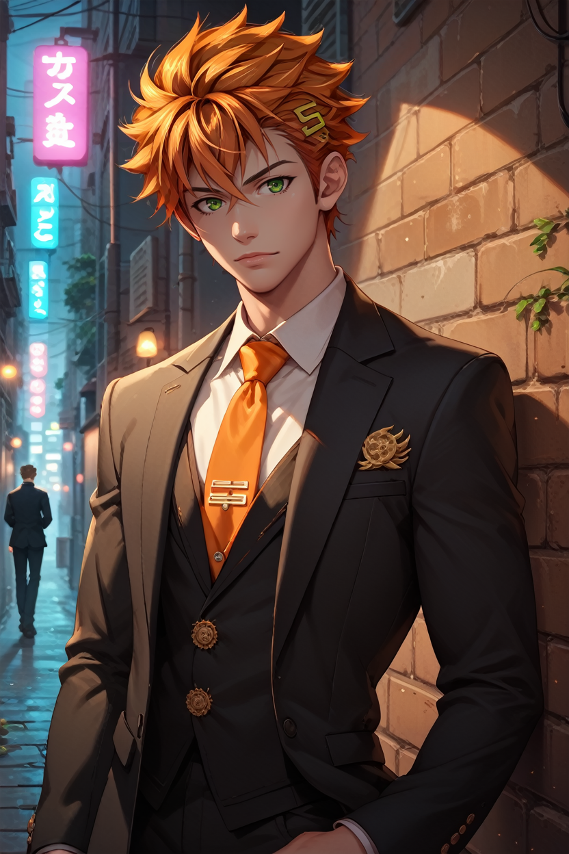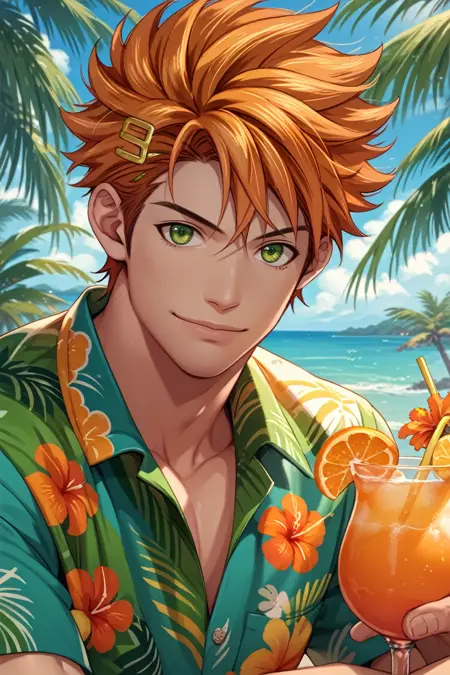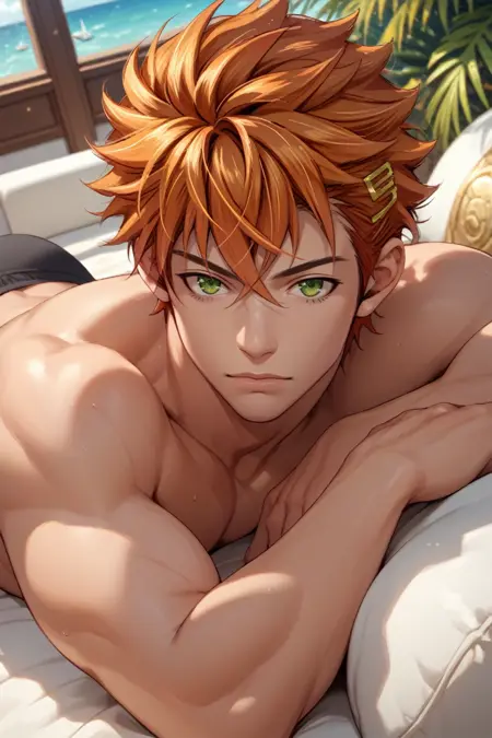FShisami, 1boy, orange hair, short hair, green eyes, hairclip