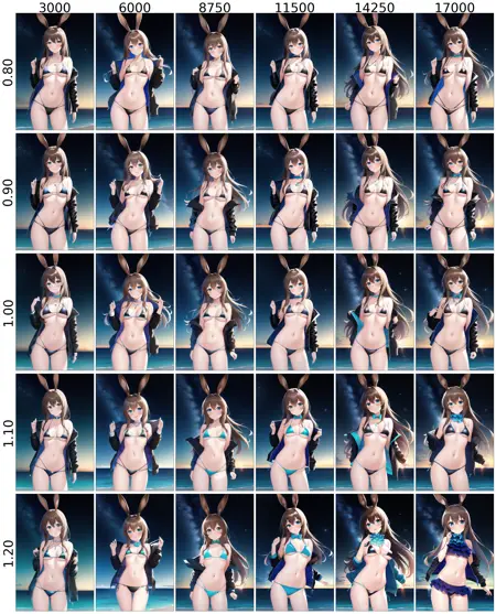 3. 'xxx.png/xxx_meta.txt',为该嵌入模型的测试图像及其对应的详细提示词和模型配置。'xxx.png' 包含一个由图像组成的表格,顶部的整数表示步数,左侧的浮点数表示提示词中使用的权重。该表格反映了嵌入在不同状态下的实际表现。