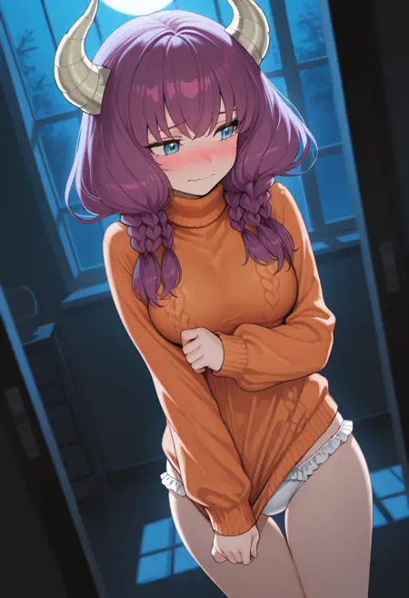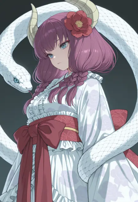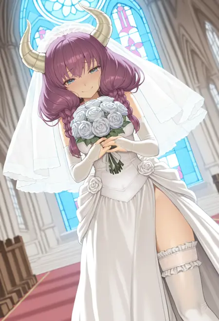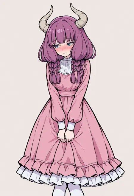 4ura, 紫色头发, 蓝色眼睛, 角, 长发, 双马尾, 项链, 无肩带上衣, 黑色上衣, 露脐设计, 白色裙子, 红色腰侧斗篷, 肘部手套, 黑色手套, 大腿靴