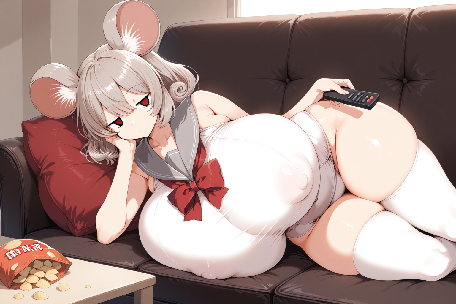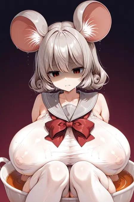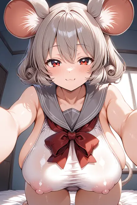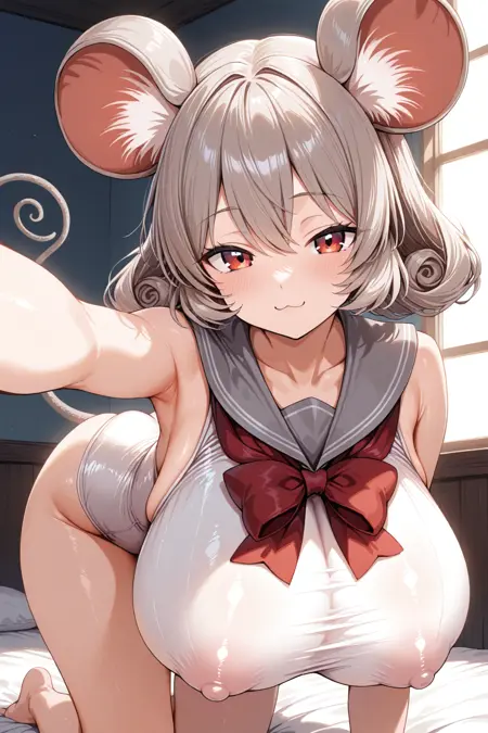 灰色水手领、白色连体泳衣、红色领结、白色过膝袜、遮盖乳头