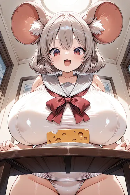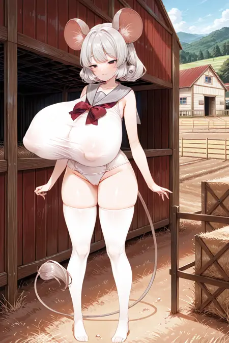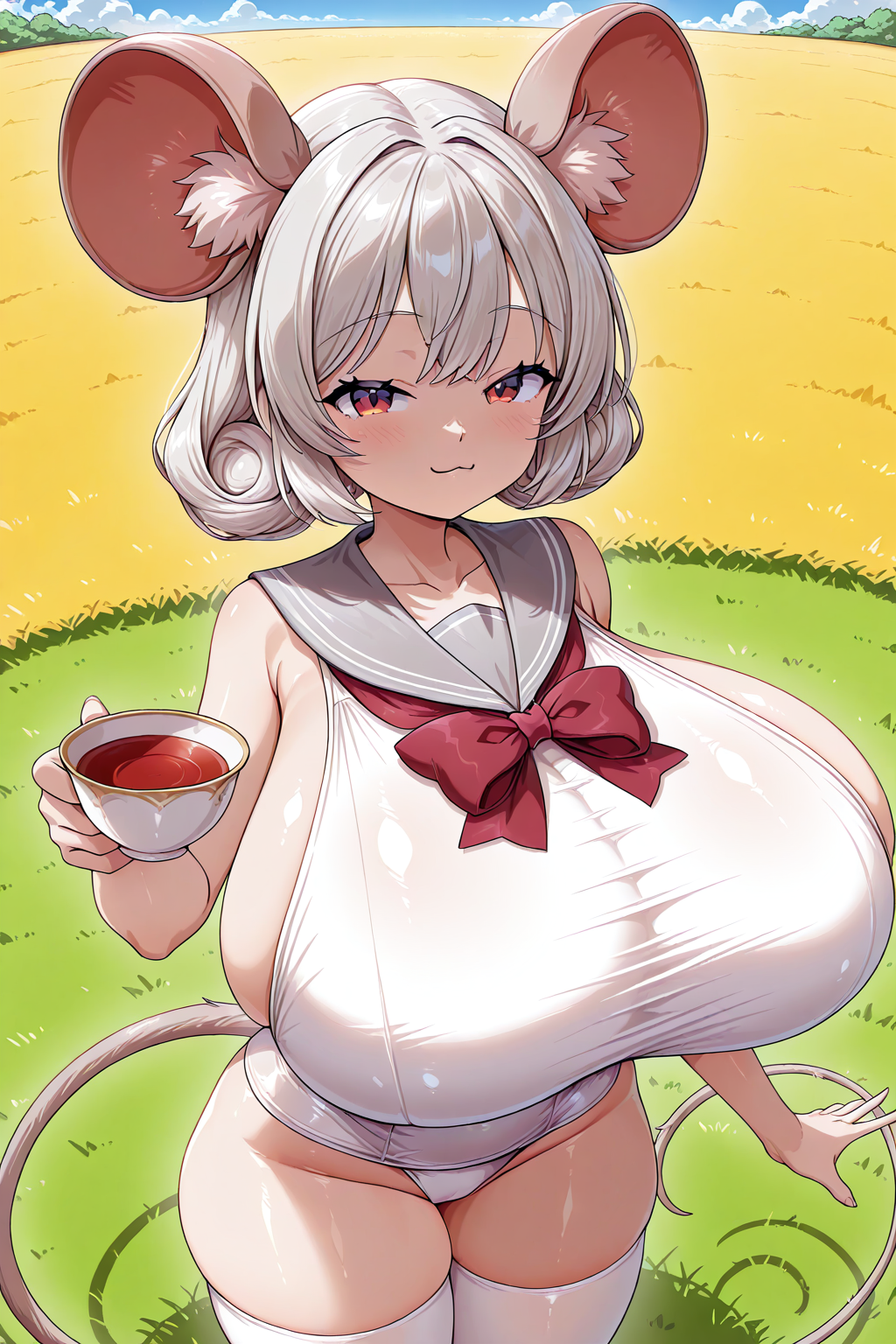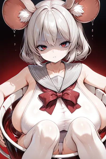 灰色水手领、白色连体泳衣、红色领结、白色过膝袜、遮盖乳头