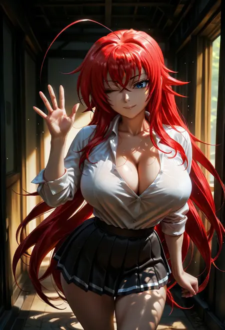 The trigger for this model is Rias Gremory, blue eyes, huge ahoge, very long hair, red hair, hair between eyes,