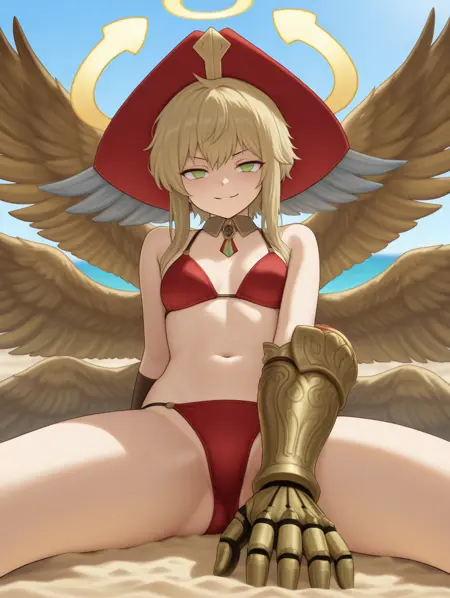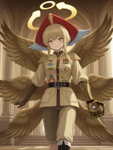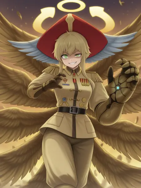 시온, 금발, 단발, 녹색 눈, 천사, 날개, 여섯 개의 날개, 환상, 빨간 모자, 날개 달린 모자, 군복, 한 손장갑, 한 줄기 부츠,