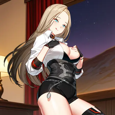 Closers_Hp, 1girl, solo, long hair, blonde hair, multicolored hair, blue eyes, mole under eye, black gloves, fingerless gloves, shorts, short shorts, asymmetrical clothes, thighhighs, single pantsleg, thigh boots, boots, high heels