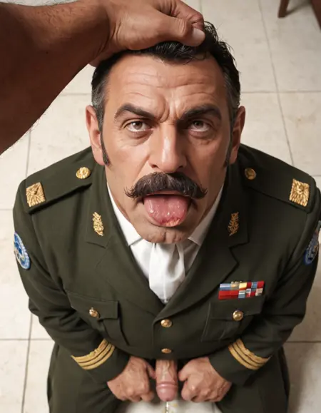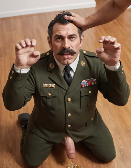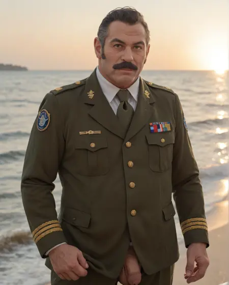 (kotetsuserizawa:1.1),mustache,sideburns,black hair,white hair,green military uniform,pants,