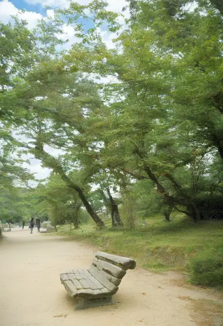syukugawa, scenery, tree, outdoors, grass, day, traditional media, bench, nature, sky, rock, real world location, photo background