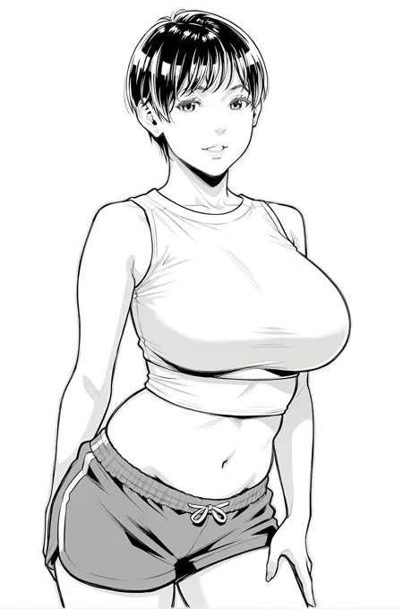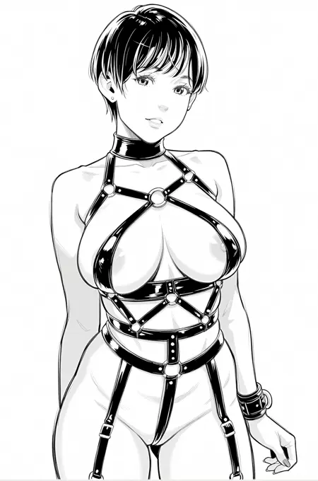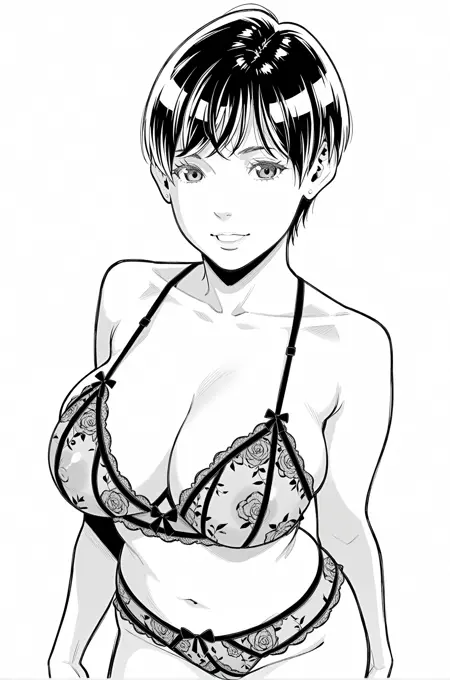 immoralwife, monochrome, greyscale, mature female, black hair, short hair, bangs, stud earrings, big breasts