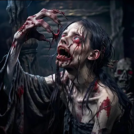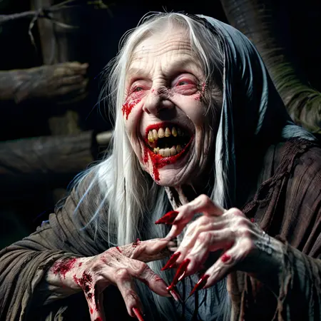 1girl, all fours, black hair, blood, blood on hands, blue eyes, blurry, blurry background, bone, candle, candlelight, cloak, closed mouth, decay, depth of field, dress, eye socket, fingernails, flame, full body, glowing, glowing eyes, habit, hag, hate, holding, holding skull, hood, hooded robe, horns, laughing, long fingernails, long hair, long sleeves, looking at viewer, multiple girls, old woman, open mouth, realistic, red eyes, robe, sash, screaming, sharp fingernails, sitting, skeleton, skull, solo, standing, statue, teeth, upper body, white hair, wide sleeves, wrinkled skin
