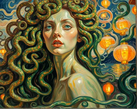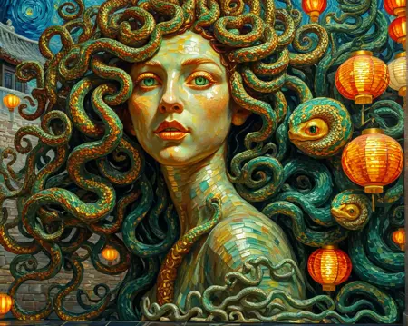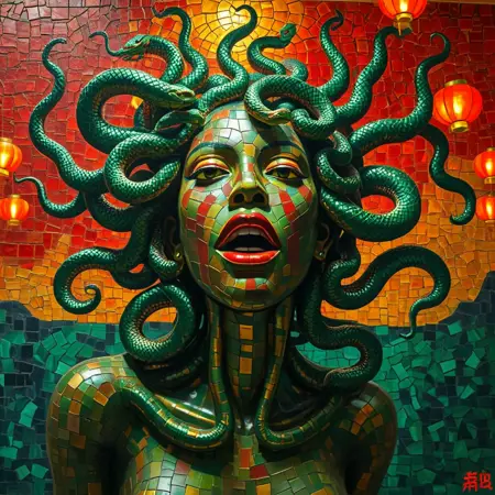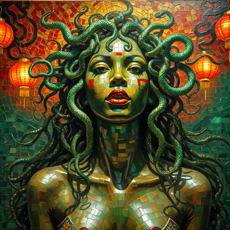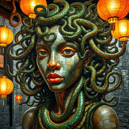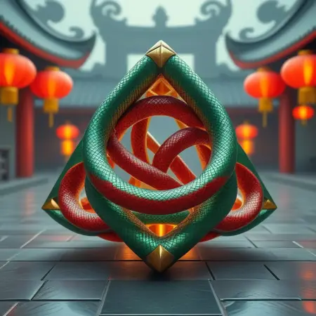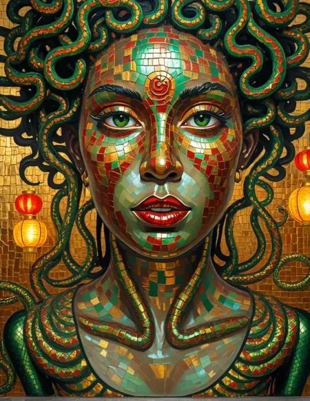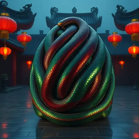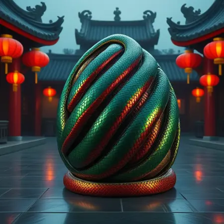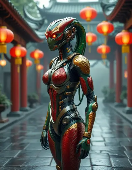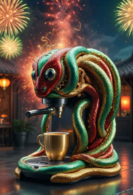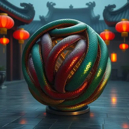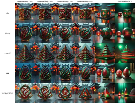 프롬프트 예시: sn4k3bug [OBJECT], 금속 비늘은 녹색, 빨간색 및 금색으로 구성됨. sn4k3bug는 [OBJECT]의 모든 부분을 형성하면서 세부 텍스처를 생성함. 배경은 전통적인 아시아 환경으로, 빛나는 빨간 lantern, 전형적인 건축물, 그리고 반사되는 돌 바닥이 포함됨. 부드러운 조명은 sn4k3bug의 반짝임을 강조하여 [OBJECT]가 일관되고 화려하게 보이도록 하며, 신비롭고 활기찬 분위기를 유지함.