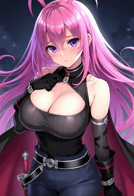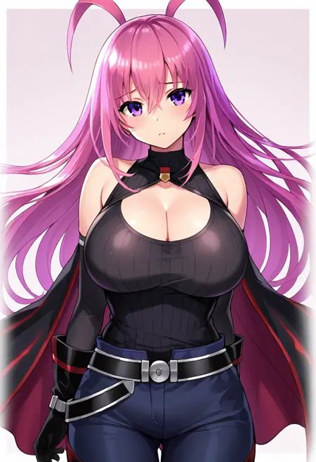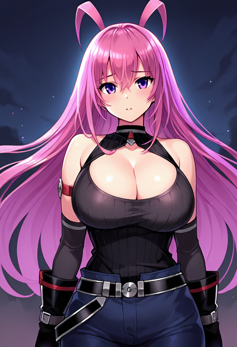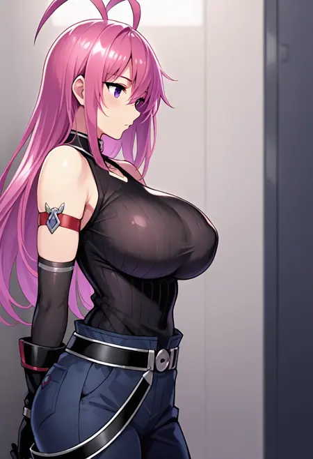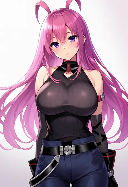 lupandefaultoutfit、ノースリーブのリブ編みセーター、青いズボン、黒い肘手袋、裸の肩、腕ストラップ、太ももブーツ