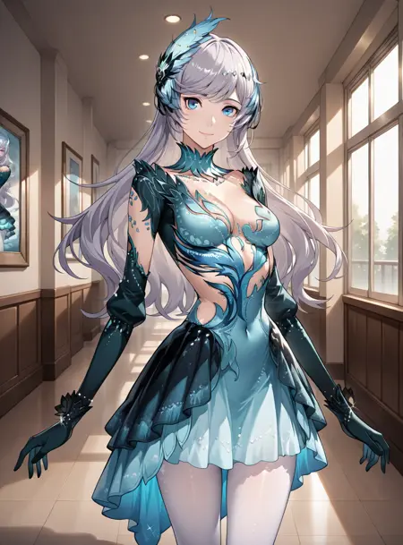 KotoneMontFigure、長い髪、フィギュアスケート用ドレス、エルボーグローブ、パンティーホース、羽飾りのヘアオーナメント、