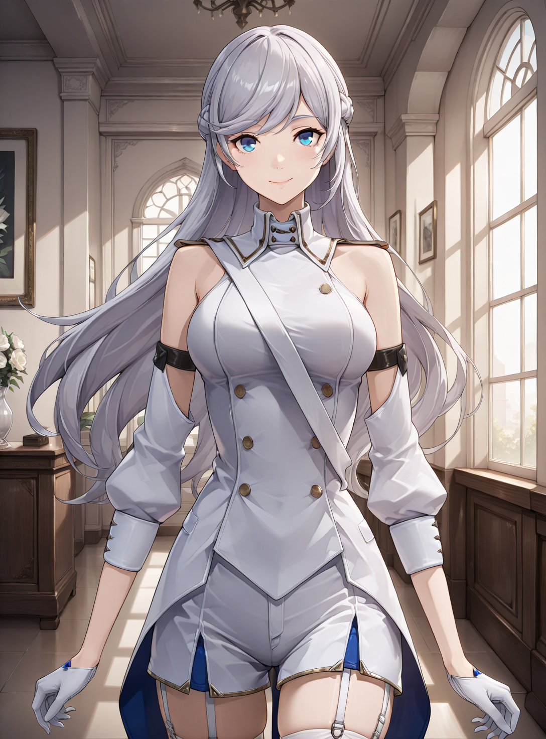 KotoneMont、長い髪、白いユニフォーム、白いショートパンツ、白い取り外し可能な袖、白い手袋、白いガーター_stockings、