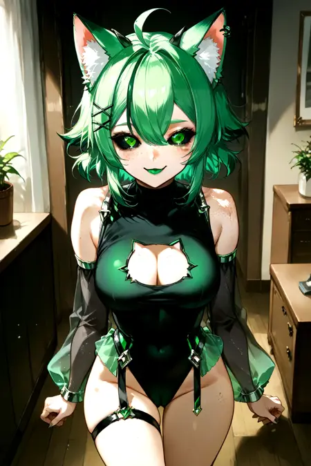 • 복장: leotard, detached_sleeves, black_thighhighs, cleavage_cutout, cat_cutout를 사용하세요.
