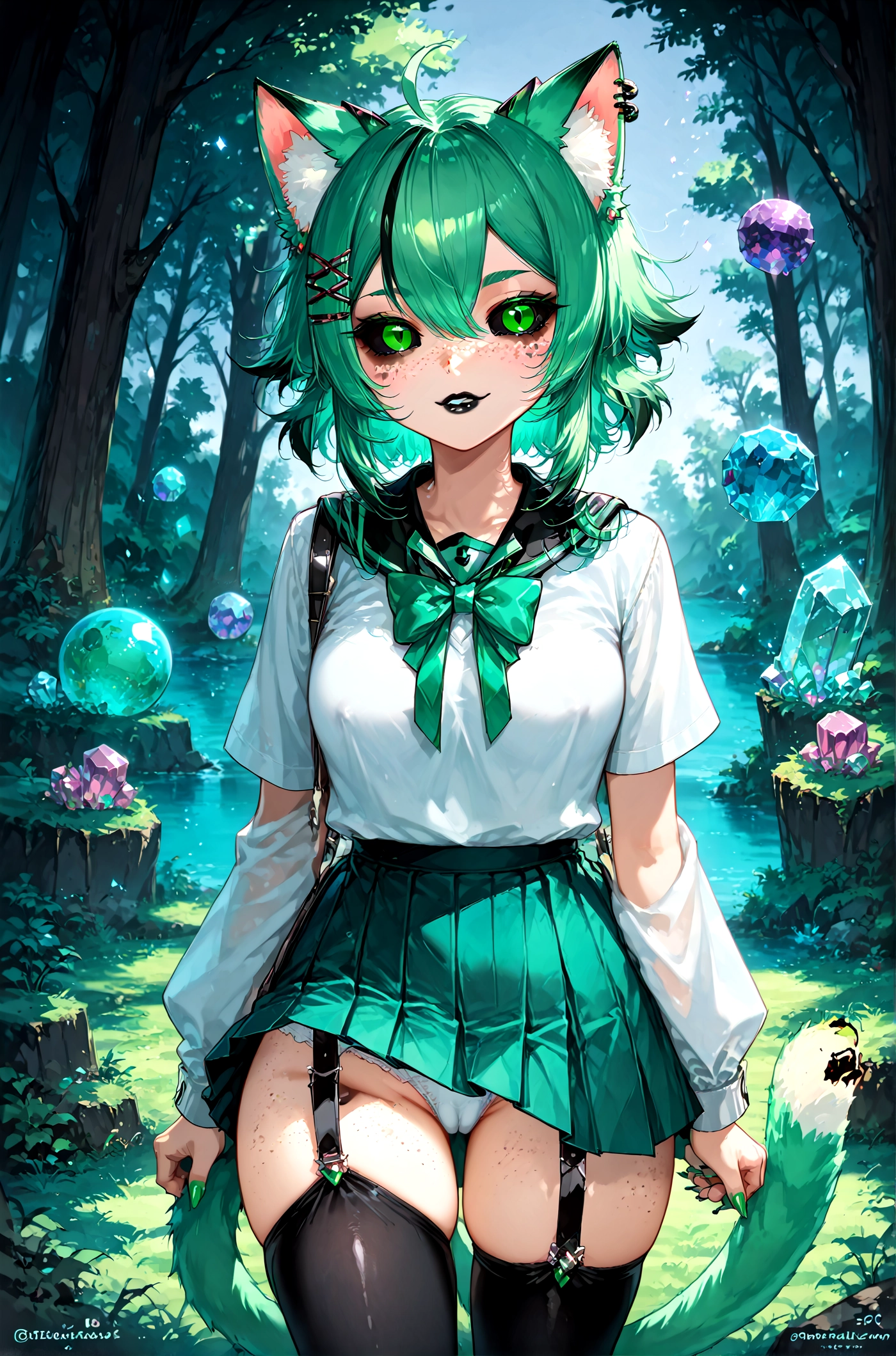 • 전체 외형: freckles, animal_ears, green_hair, short_hair, hair_ornament, green_eyes를 사용하세요. 눈동자가 검정색인 경우 옵션으로 black_sclera를 사용할 수 있습니다.
