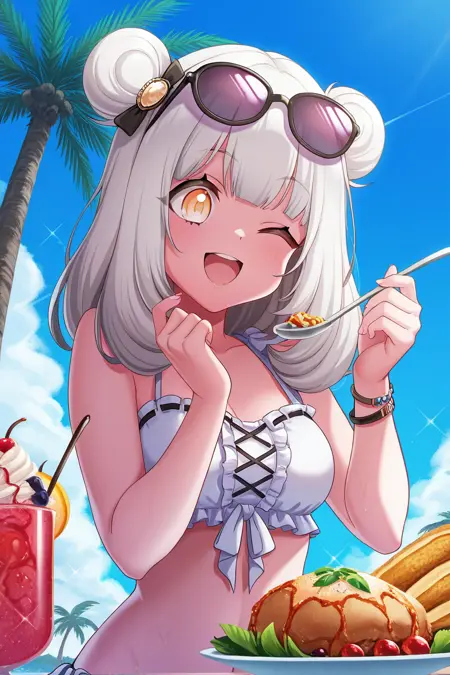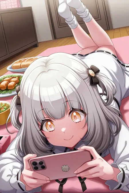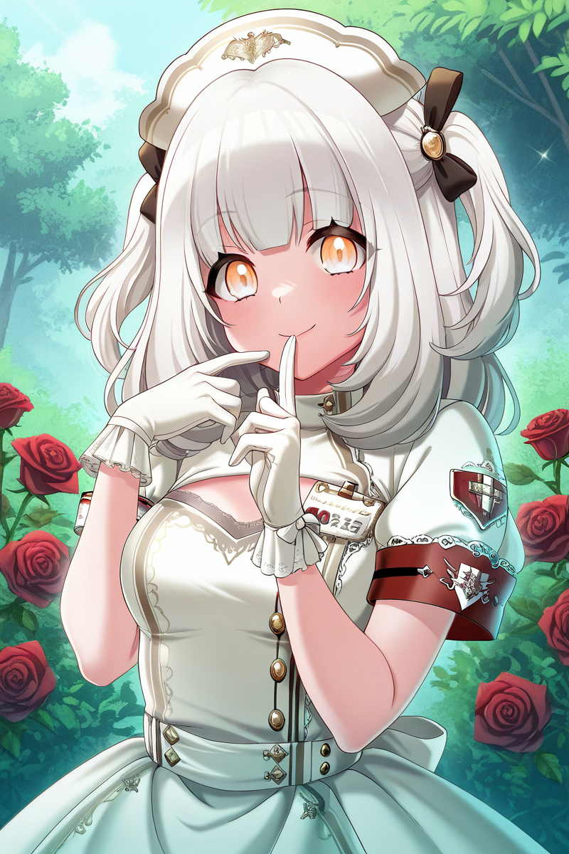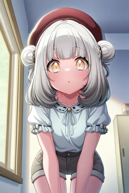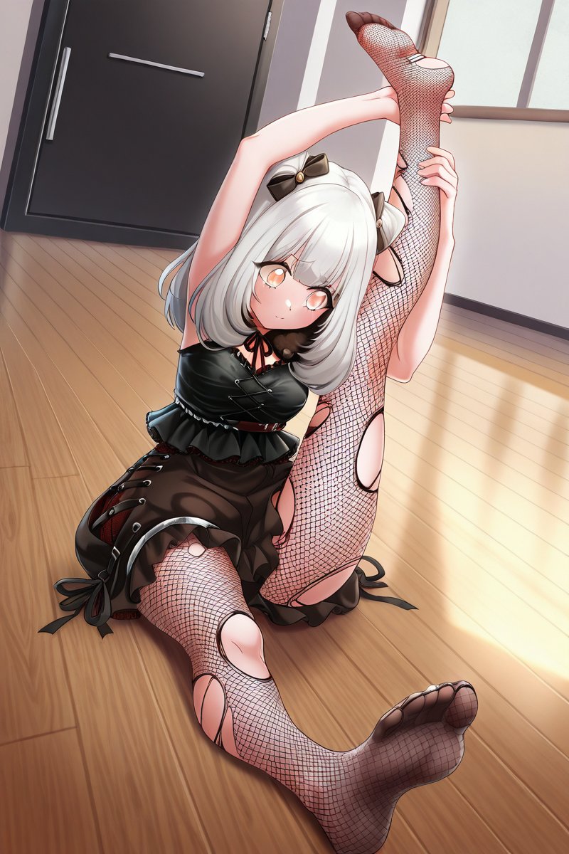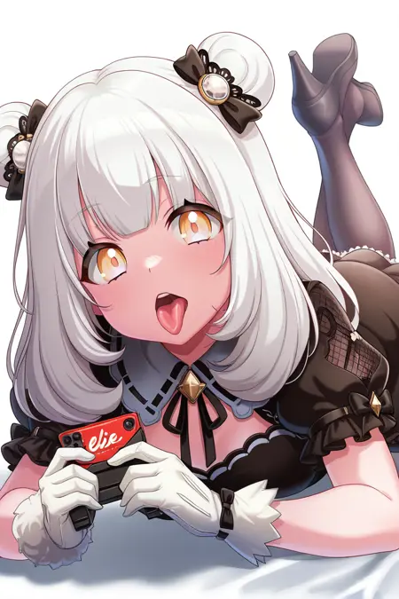 elsie, 1girl, solo, double bun, hair bun, white hair, fishnets, stockings, skirt, yellow eyes, looking at viewer, bangs, bow, fur trim, stage outfit
