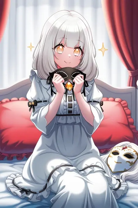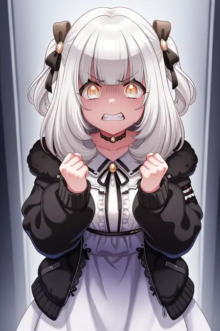 elsie, 1girl, solo, dress, jacket, white dress, yellow eyes, black jacket, ribbon, frills, bangs, choker, white hair, black ribbon