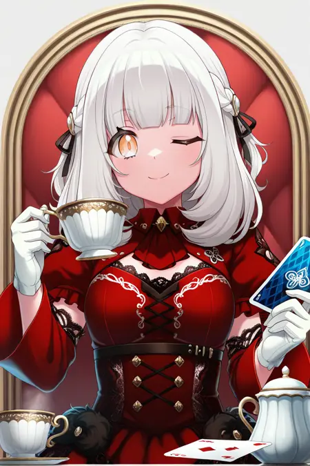 elsie, 1girl, animal ears, animal hands, fishnets, drill hair, grey hair, red skirt, open mouth, fangs, tiara, solo, tail, thighhighs, skirt, garter straps, collar, breasts, bangs, corset, navel, chains, red belt, wolf suit, white outfit