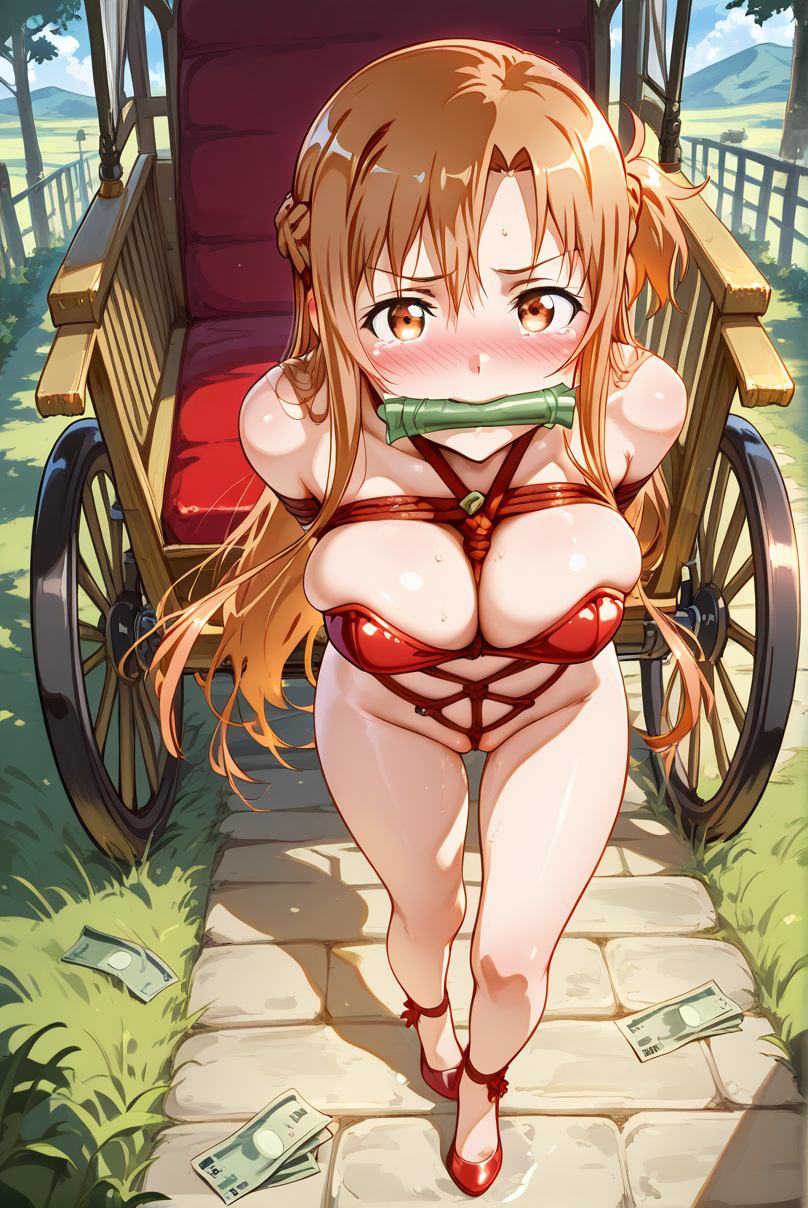 lora:PullingCarriage:1,拉车,着装男性与裸体女性,马车,1个女孩,长发,乳房,大乳房,黑发,1个男孩,肚脐,乳头,异性,户外,双手背在身后,裸上身,被绑,BDSM,束缚,被限制,嘴塞,被堵嘴