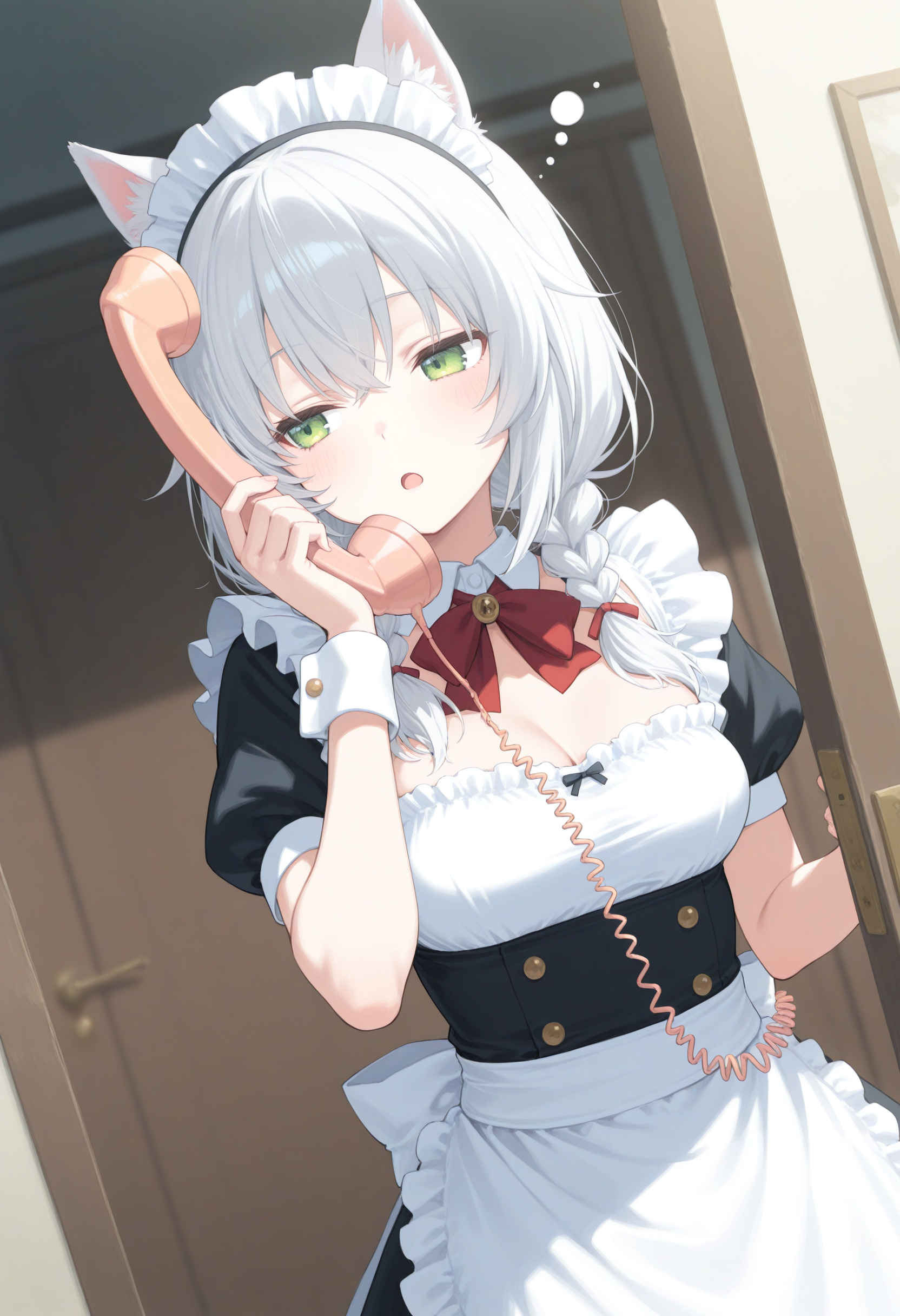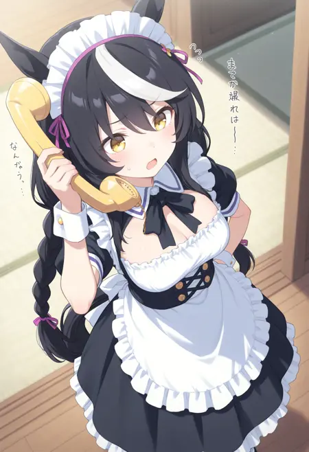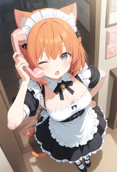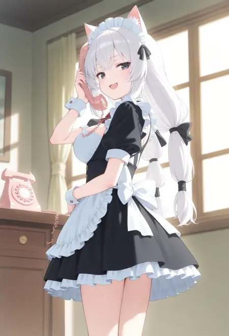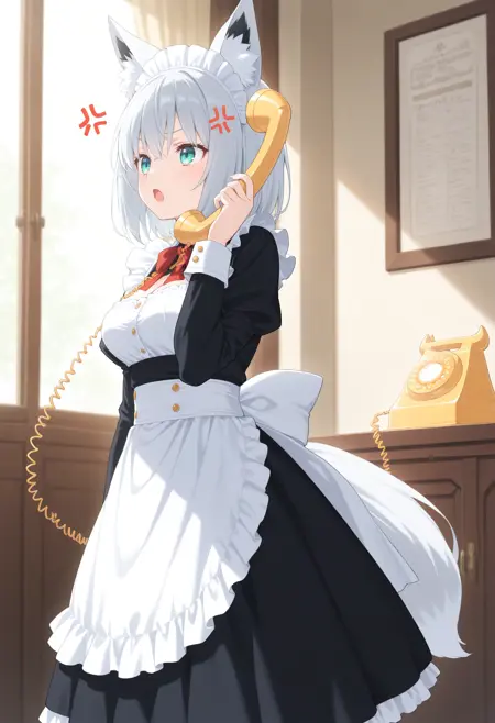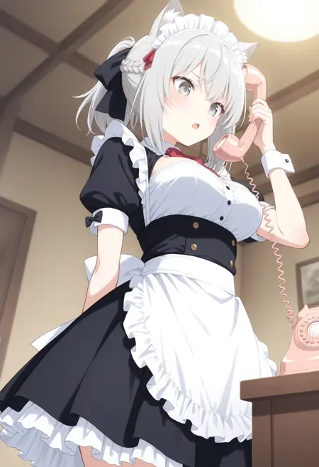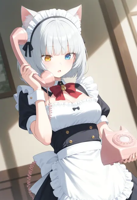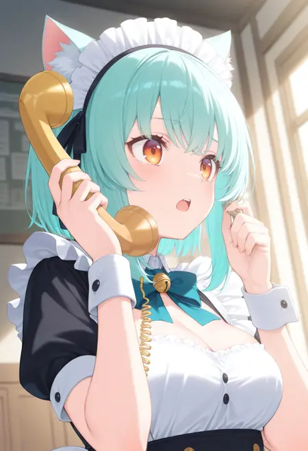 人間ではなく獣人的なケモミミを持ったキャラクターが電話をする場合、人間のように目の横ではなく頭の上に耳が有りますが通常の電話では耳に届かないので専用電話を使用させるLoRAです。