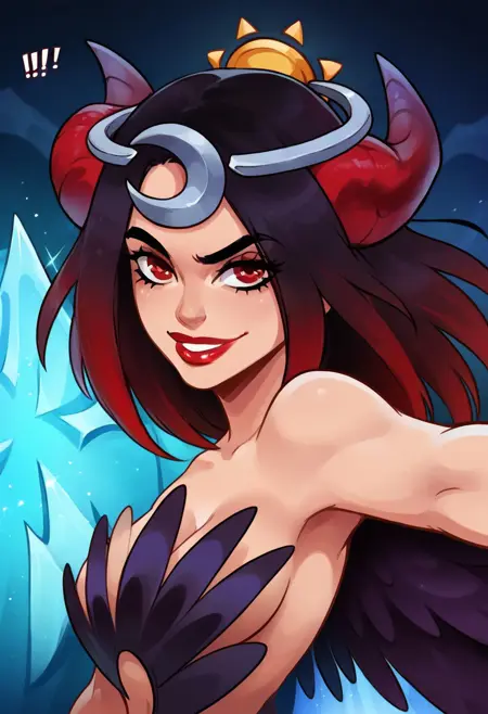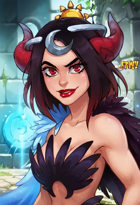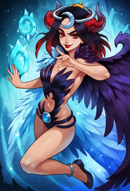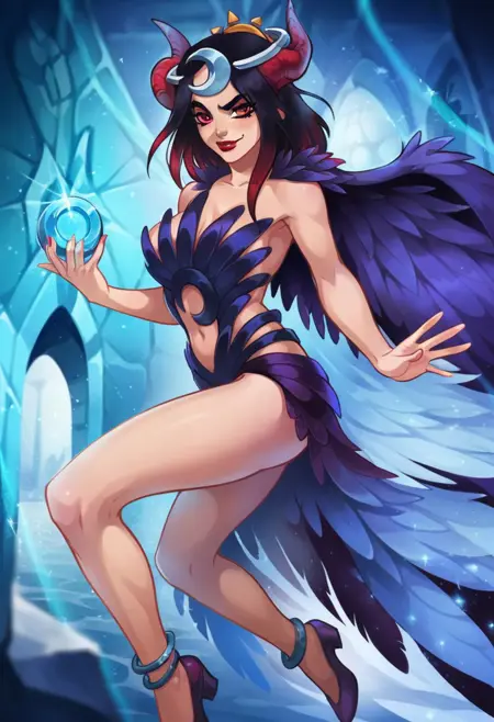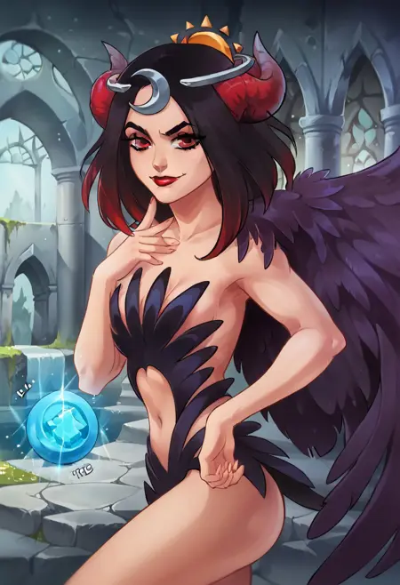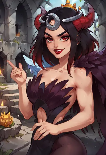 CelesteHW, 1소녀, 혼자, 긴 머리, 검은 머리, 다색 머리, 뿔, 악마 뿔, 붉은 눈, 머리 장식, 입술, 빨간 립스틱, 가슴, 큰 가슴, 검은 드레스, 깃털 드레스, 날개, 깃털 날개, 배꼽, 허리, 고랑, 넓은 엉덩이, 한쪽 양말, 검은 양말, 검은 날개, 메이크업, 보석, 발목 장식, 어깨 노출