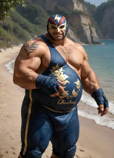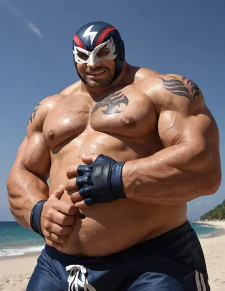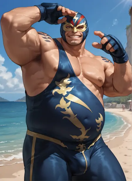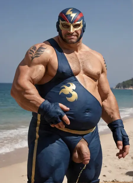 (raiden:1.1),摔跤服,胖男人,摔跤面具,紧身衣,无指手套,肘部支撑,肩部纹身,