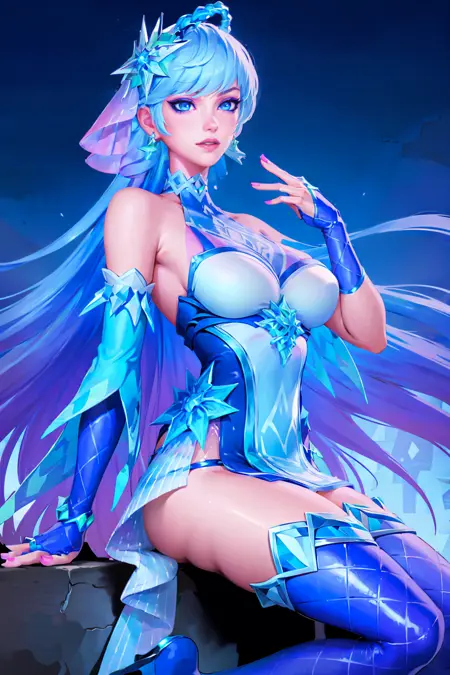 Prompt: Yue_Frosty, 1girl, solo, long hair, blue hair, multicolored hair, gradient hair, shiny, shiny hair, braid, earrings, looking at viewer, blue eyes, nose, lips, pink lips, makeup, parted lips, bare shoulders, breasts, large breasts, dress, blue dress, bracelet, gloves, elbow gloves, blue gloves, fingerless gloves, thighhighs, blue thighhighs, boots, high heels, jewelry, portrait