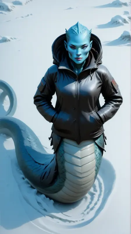 <lora:NagaIllustrious:1>naga, with Scarlet scales, Snow Queen, (angry:0.3), One Hand on Chin, masterpiece, best quality, full body view, leaning back, moonlight during the night
