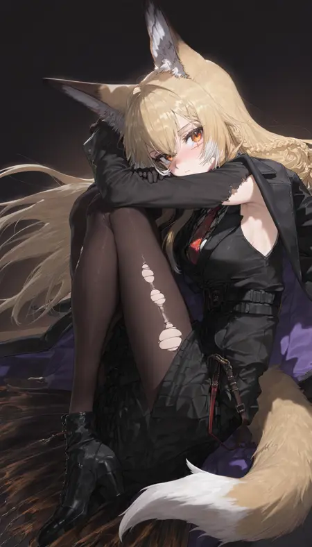 오렌지색 눈, 금발, 옆머리 땋은 머리, 동물 귀 털, 여우 꼬리, 얼굴 흉터, 목 타투, 헤드웨어를 통한 귀 노출, 검은 헤드웨어,