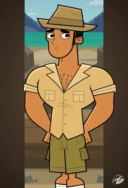 Diego Olivo, 1boy, solo, tanned skin, brown eyes, round pupils, chest hair, muscular, Big chest, Big pecs, thick eyebrows, hat, ochre shirt, olive green shorts, white socks, brown boots,