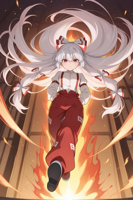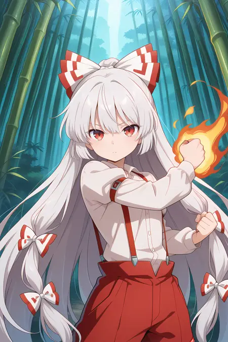 fujiwara no mokou, 1girl, solo, red eyes, white hair, very long hair, small breasts,, fujiwara no mokou \(eternal\), adapted costume, white bow, multiple hair bows, grey shirt, collared shirt, puffy long sleeves, juliet sleeves, red suspenders, red pants, red shoes,