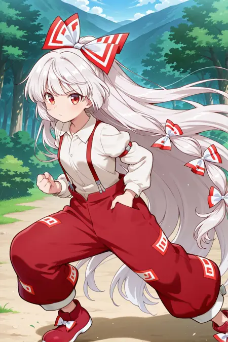 fujiwara no mokou, 1girl, solo, red eyes, white hair, very long hair, small breasts,, fujiwara no mokou \(eternal\), adapted costume, white bow, multiple hair bows, grey shirt, collared shirt, puffy long sleeves, juliet sleeves, red suspenders, red pants, red shoes,