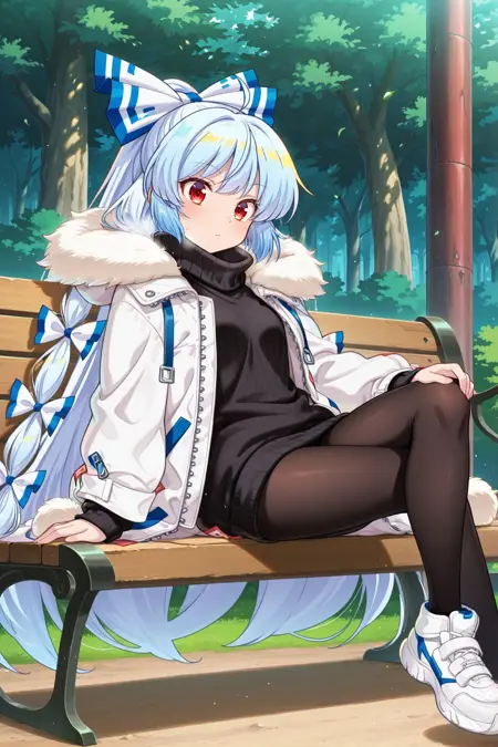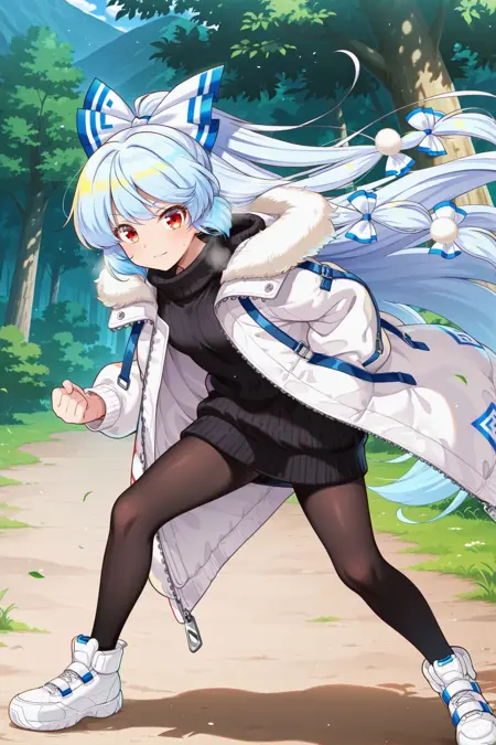 fujiwara no mokou, 1girl, solo, red eyes, light blue hair, very long hair, small breasts, fujiwara no mokou \(hourai heat pump\), alternate hair color, alternate costume, hair bow, blue bow, pom pom hair ornament, hood down, white coat, fur-trimmed coat, long sleeves, ofuda on coat, open coat, zipper, turtleneck, black sweater, black pantyhose, white sneakers,