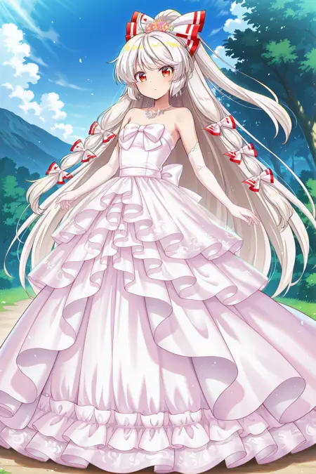 fujiwara no mokou, 1girl, solo, red eyes, white hair, very long hair, high ponytail, small breasts,, fujiwara no mokou \(burning white phoenix\), alternate costume, alternate hairstyle, hair bow, pink bow, hair ornament, kanzachi, silver necklace, bare shoulders, white dress, wedding dress, long dress, frilled dress, strapless dress, white chest bow, white gloves, elbow gloves, holding bouquet,