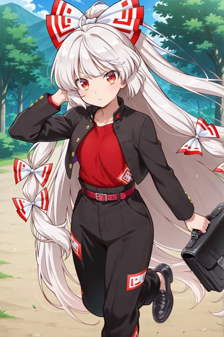 fujiwara no mokou, 1girl, solo, red eyes, white hair, very long hair, small breasts,, fujiwara no mokou \(fiery and solitary student\), alternate costume, hair bow, white bow, mulitple hair bows, black jacket, open jacket, gold buttons, red shirt, red belt, black pants, ofuda on pants, black shoes, holding bag, school bag,
