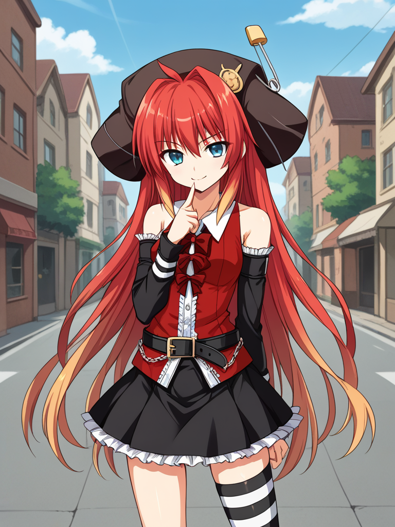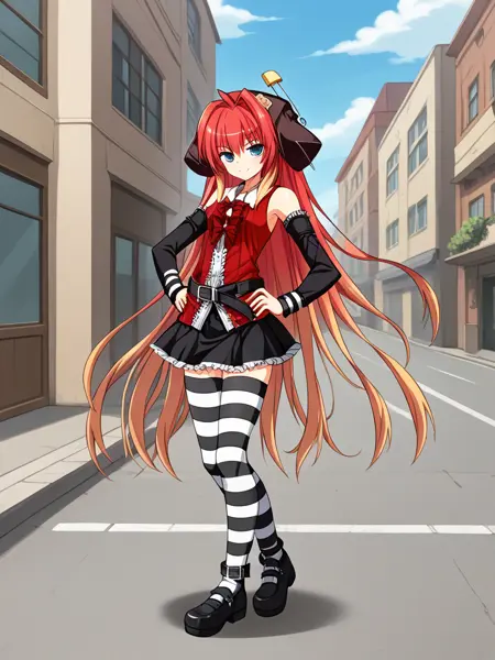 主服装:momijiEXAEXSFA,红发,渐变发色,超长发,多色发,单股发束,呆毛,水蓝色眼睛,帽子,红衬衫,有领衬衫,可拆卸袖子,露肩,颈结,红色蝴蝶结,黑色裙子,荷叶边,腰带,链条,不对称裤装,单侧过膝袜,单只袜子,条纹,玛丽珍鞋