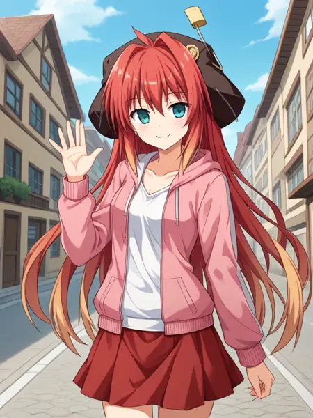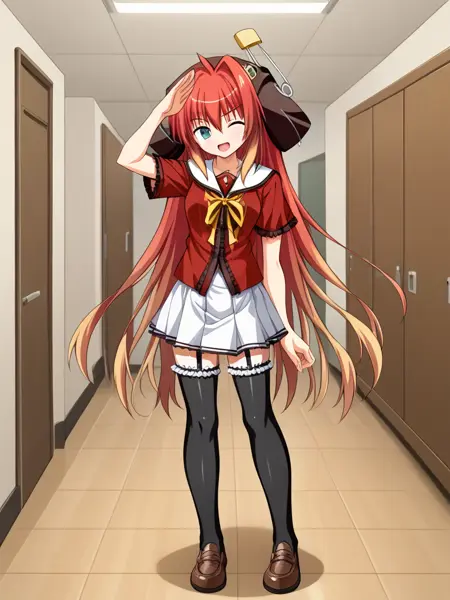 学校服装:momijiEXAEXSFA,红发,渐变发色,超长发,多色发,单股发束,呆毛,水蓝色眼睛,帽子,红衬衫,短袖,水手服,黄色丝带,颈饰丝带,白裙,黑色过膝袜,荷叶边过膝袜,吊袜带,棕色鞋子,校服