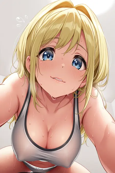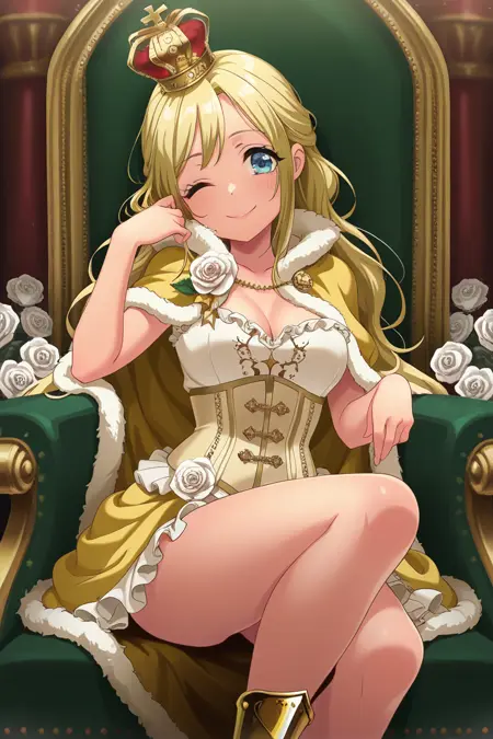 yuka, 1girl, one eye closed, solo, breasts, cleavage, blonde hair, smile, shorts, eyewear on head, sunglasses, jacket, jewelry, earrings, open jacket, stage outfit, on stage