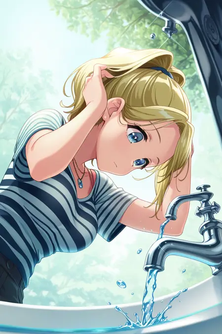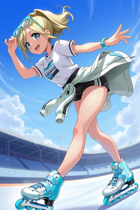 yuka, 1girl, blonde hair, solo, school uniform, ponytail, skirt, blue eyes, smile, jacket, open mouth, red bow, portrait